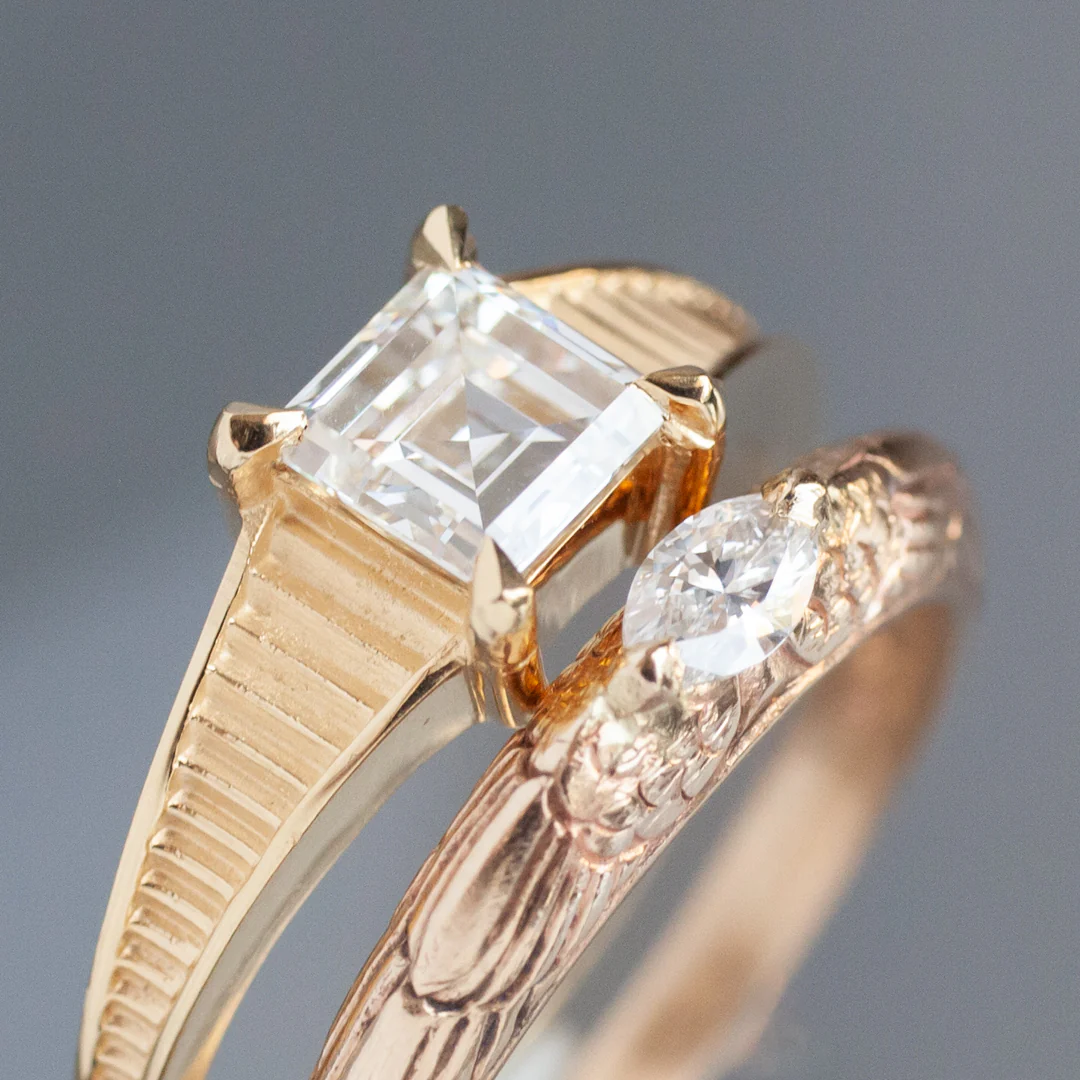 Two wings arc over each shank like a poised ascent, cradling a marquise diamond at the center — a talon of light, a compass of longing. It doesn’t whisper commitment; it declares transformation. A vow to take flight, with or without permission.