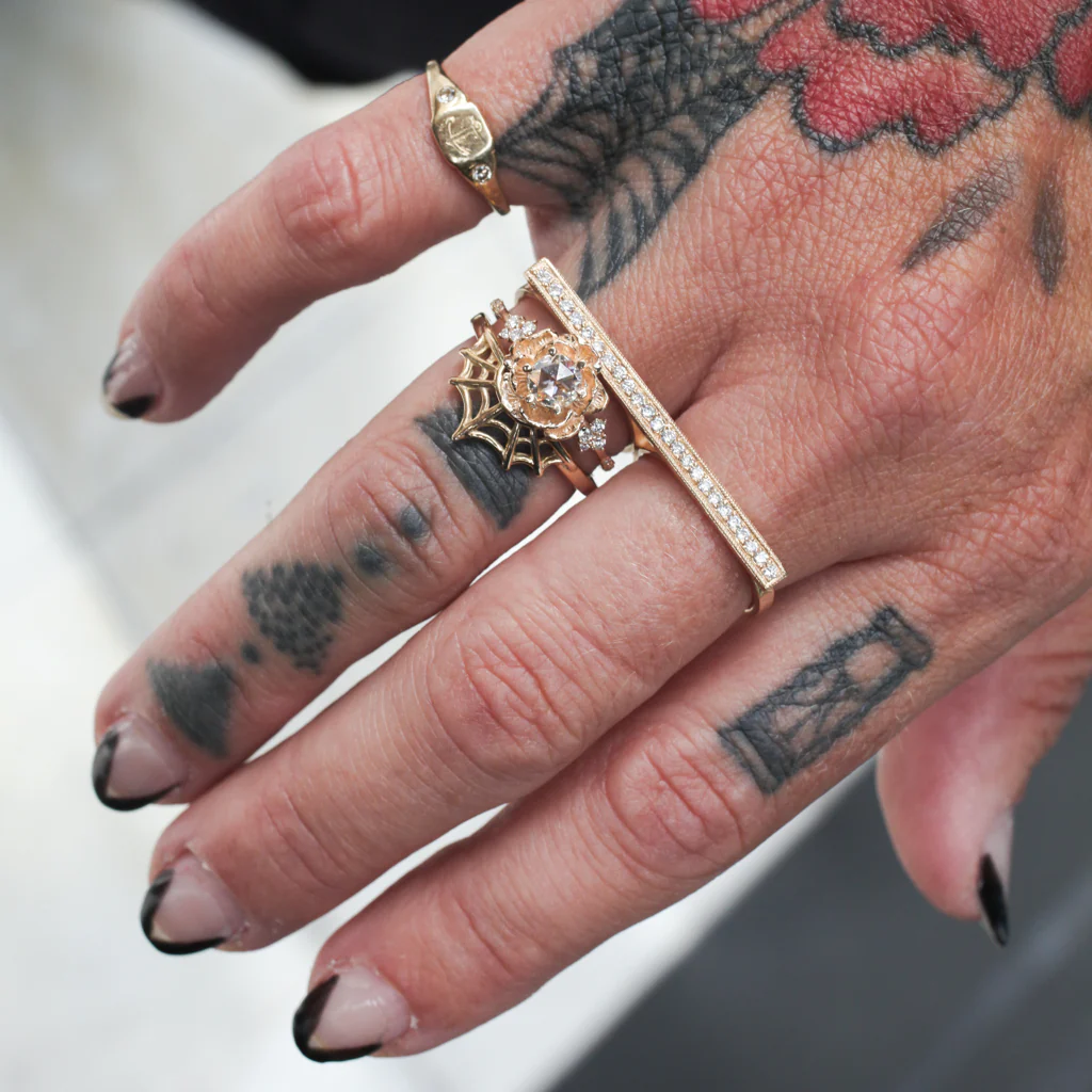 Two fingers. One force. It bridges gesture and grip, thought and action — like stars scattered across resolve. Worn across the hand like a spell, it’s light in weight, heavy in meaning.