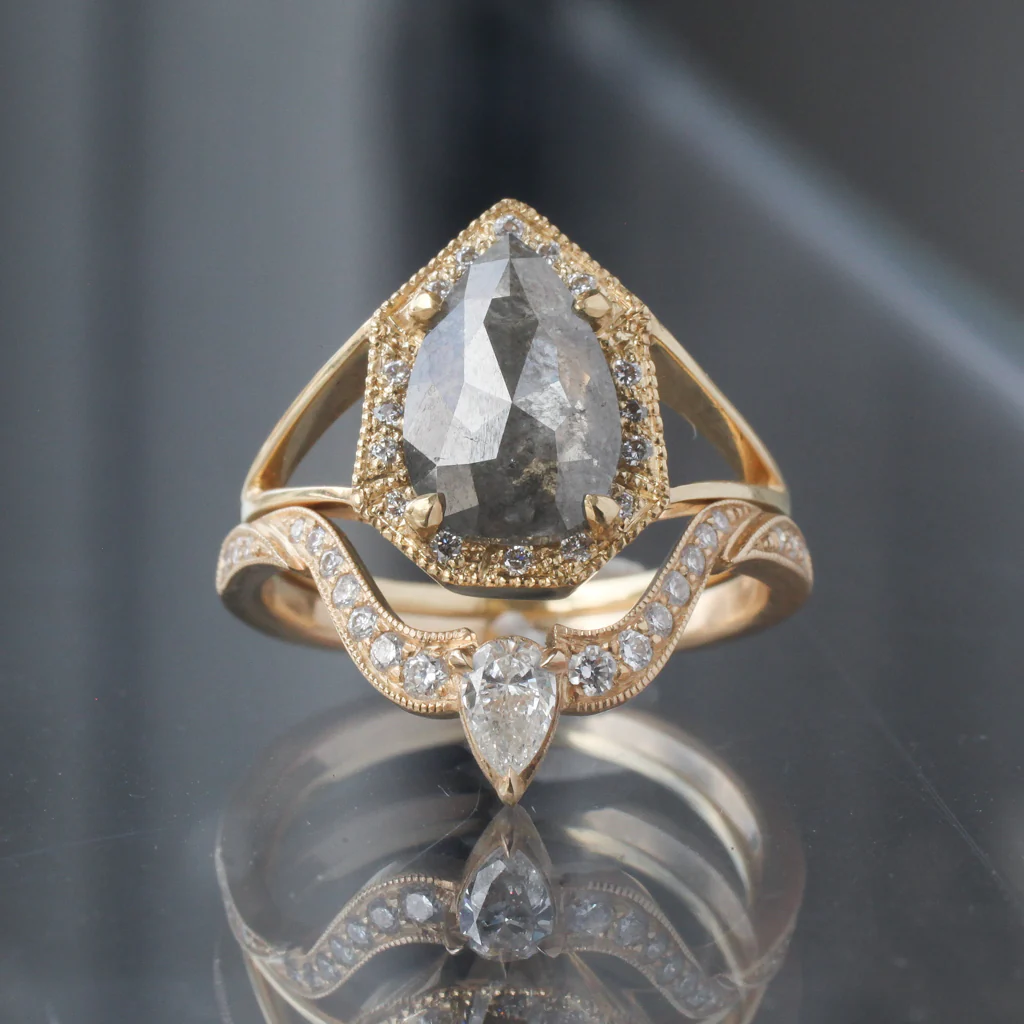 Tall arches filled with graduated round brilliant diamonds holding aloft a prong set white diamond pear to stack snugly against the deep curves of your engagement ring.