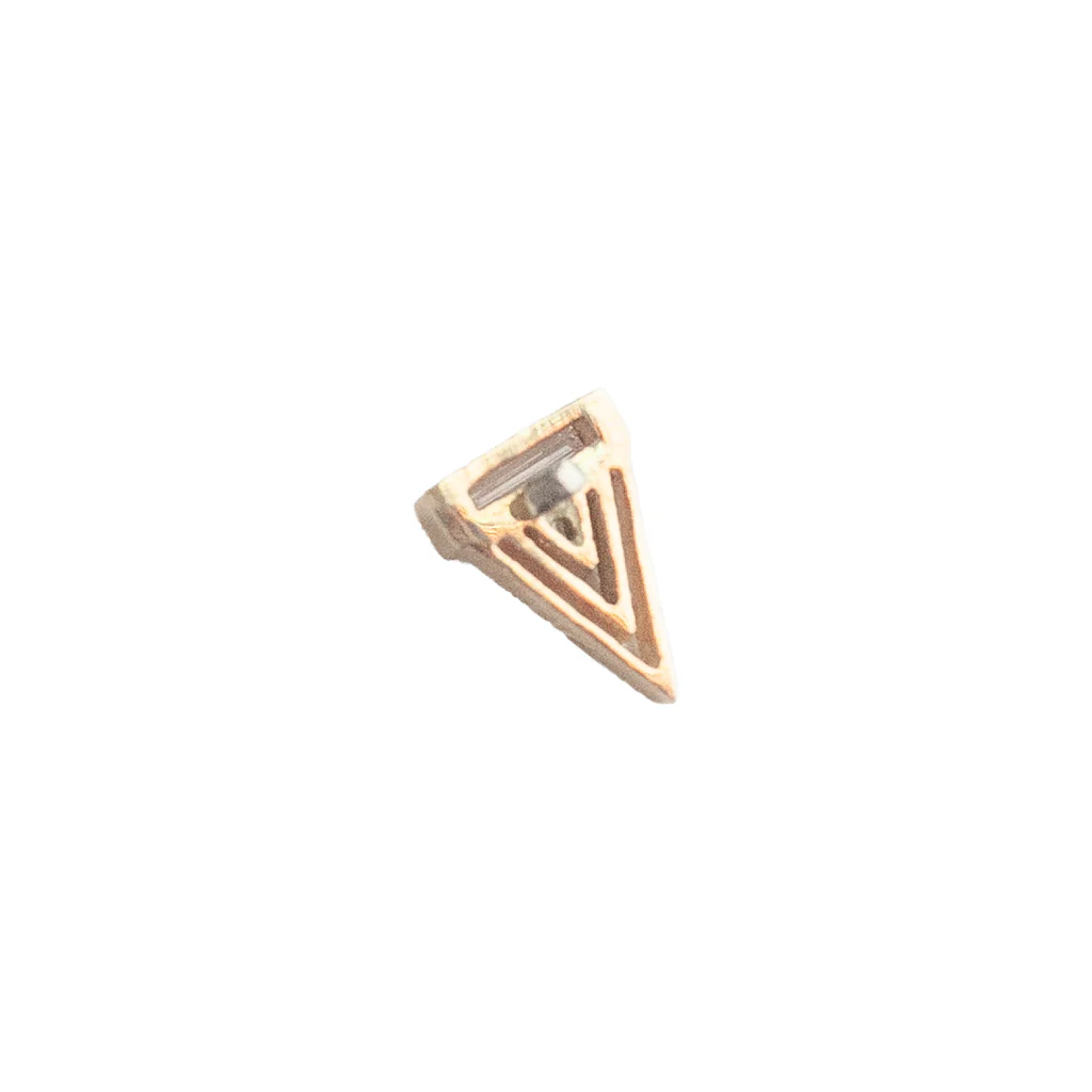 Ancient magic in geometric mediation, three concentric open work triangles, capped with a white diamond baguette bar of light.