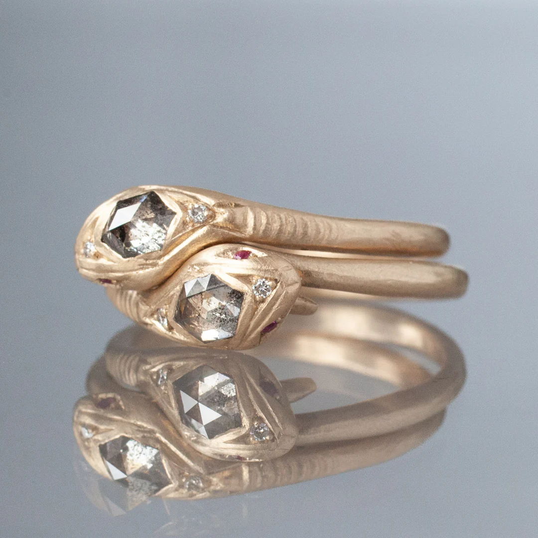 Two serpents, entwined in intention, come together to form a single ring. Wear them as one or split them across two hands to honor the truest bond between two souls. Each snake crowned with ruby eyes, like mirrored guardians.