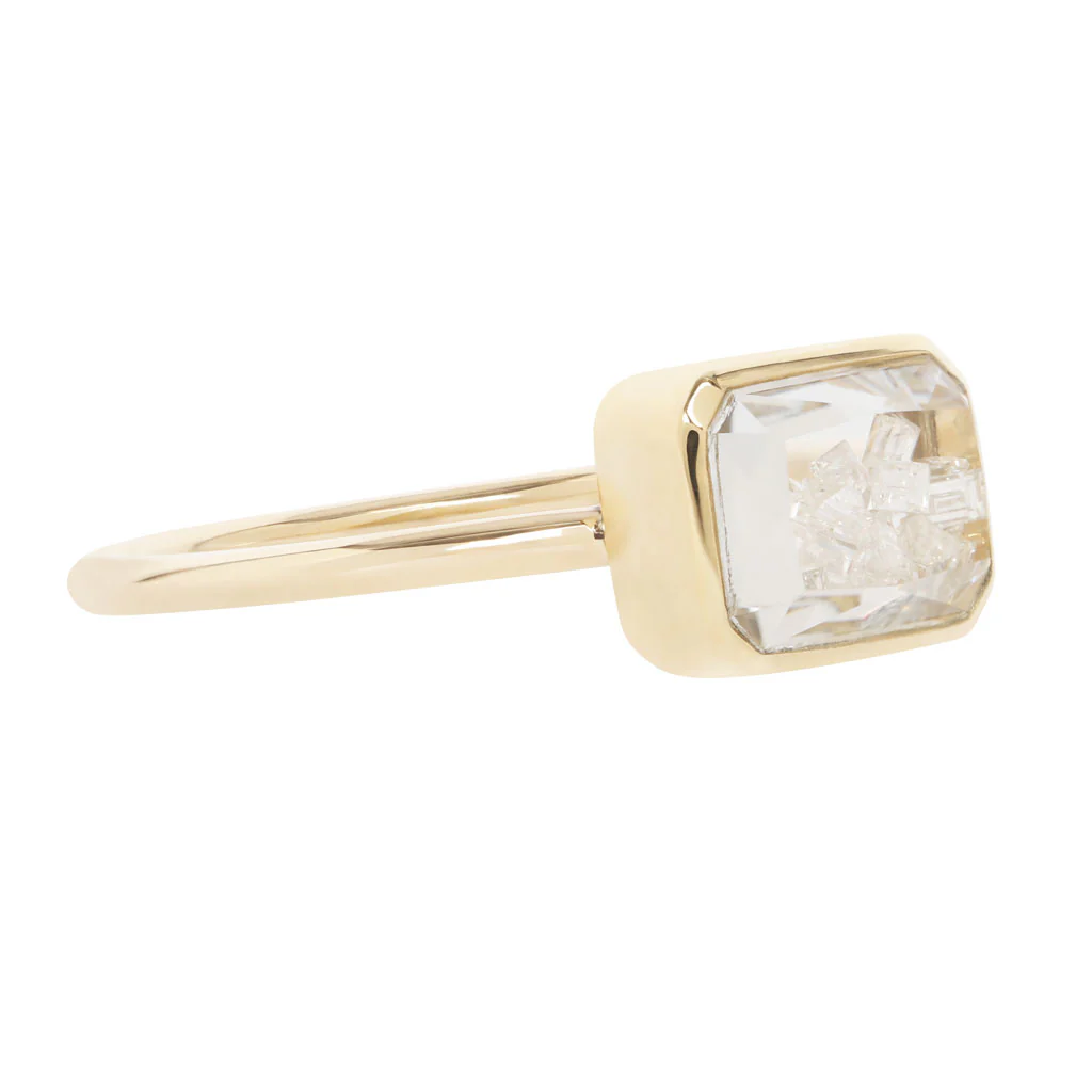 Tiny diamond dancers glide inside an east-west emerald-cut white sapphire — an 8x10mm jewelry box of light and motion. Within its crystalline chamber, loose blue sapphires shimmer and shift like stars mid-twirl. A miniature ballet of brilliance, captured in a ring that holds both chaos and choreography.